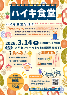 3月14日(土)にあやセンターぐるぐる(東京メトロ千代田線綾瀬駅高架下)にて、食と体験の地域イベント「ハイキ食堂」を開催いたします。